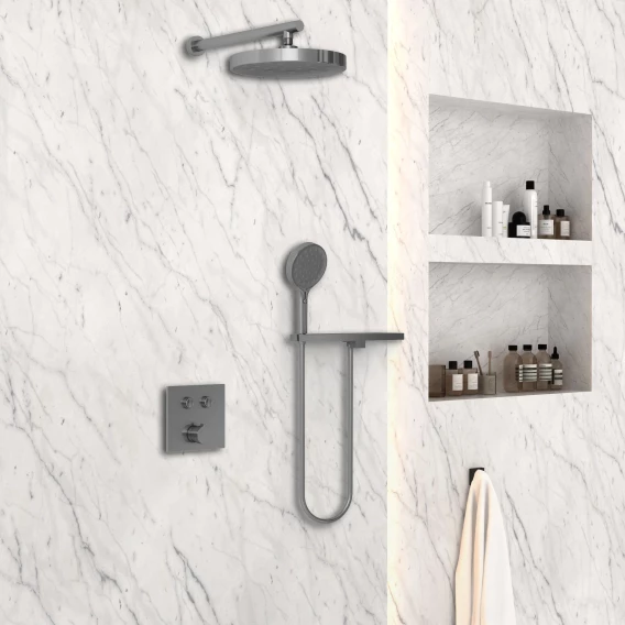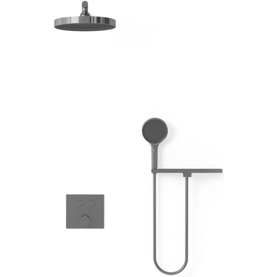 Душевой шланг, Душевая лейка, Подключение для душевого шланга с держателем, Полочка, Верхний душ, Скрытая монтажная часть, Смеситель, Кронштейн