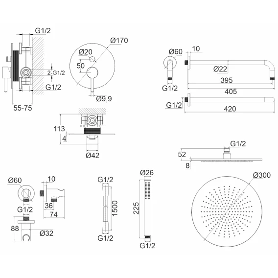 Душевой шланг, Душевая лейка, Подключение для душевого шланга с держателем, Верхний душ, Скрытая монтажная часть, Смеситель, Кронштейн