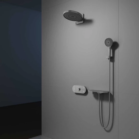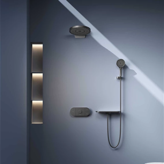 Душевой шланг, Душевая лейка, Держатель для душевой лейки, Полочка, Верхний душ, Излив, Скрытая монтажная часть, Кронштейн, Термостат