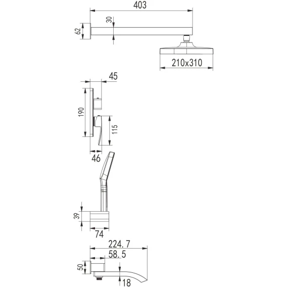 Аэратор, Душевой шланг, Душевая лейка, Держатель для душевой лейки, Подключение для душевого шланга, Верхний душ, Излив, Скрытая монтажная часть, Смеситель, Кронштейн