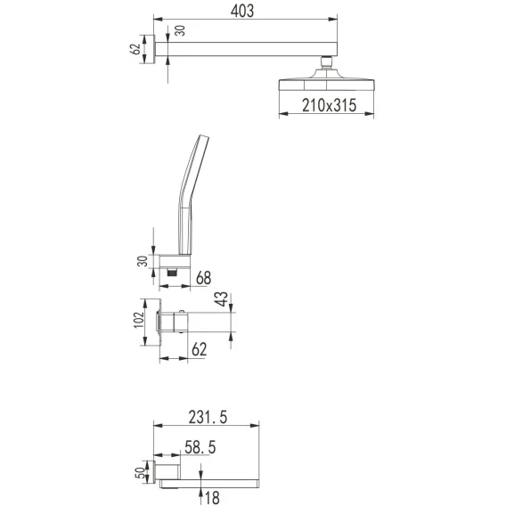 Аэратор, Душевой шланг, Душевая лейка, Подключение для душевого шланга с держателем, Верхний душ, Излив, Скрытая монтажная часть, Кронштейн, Термостат