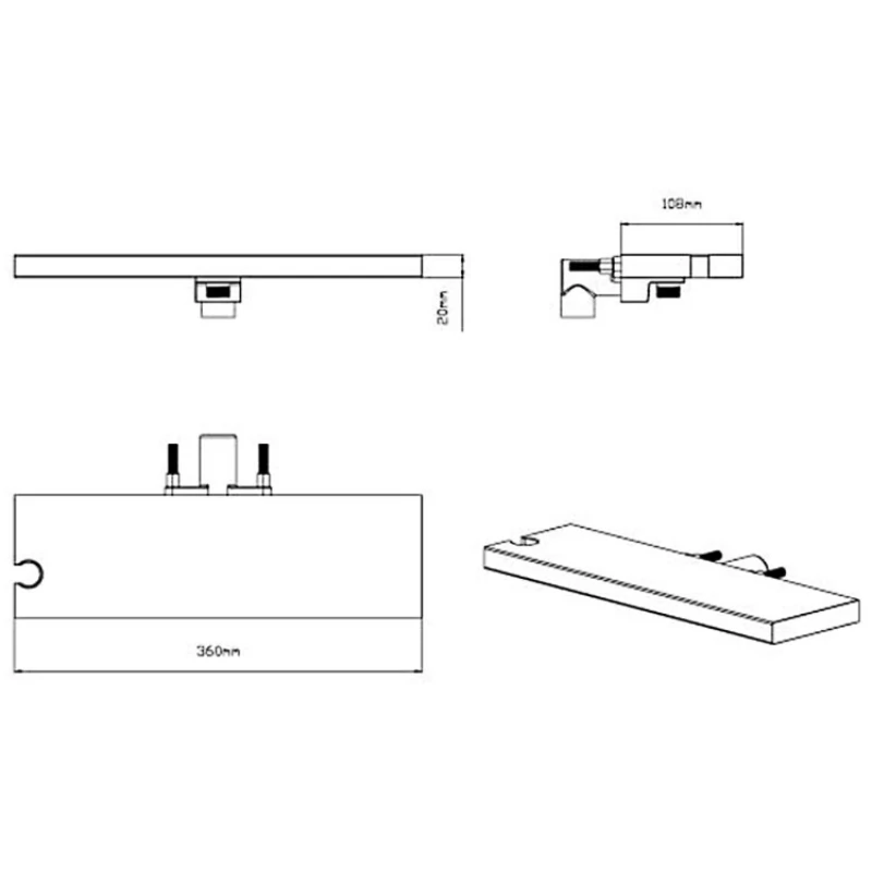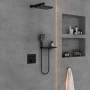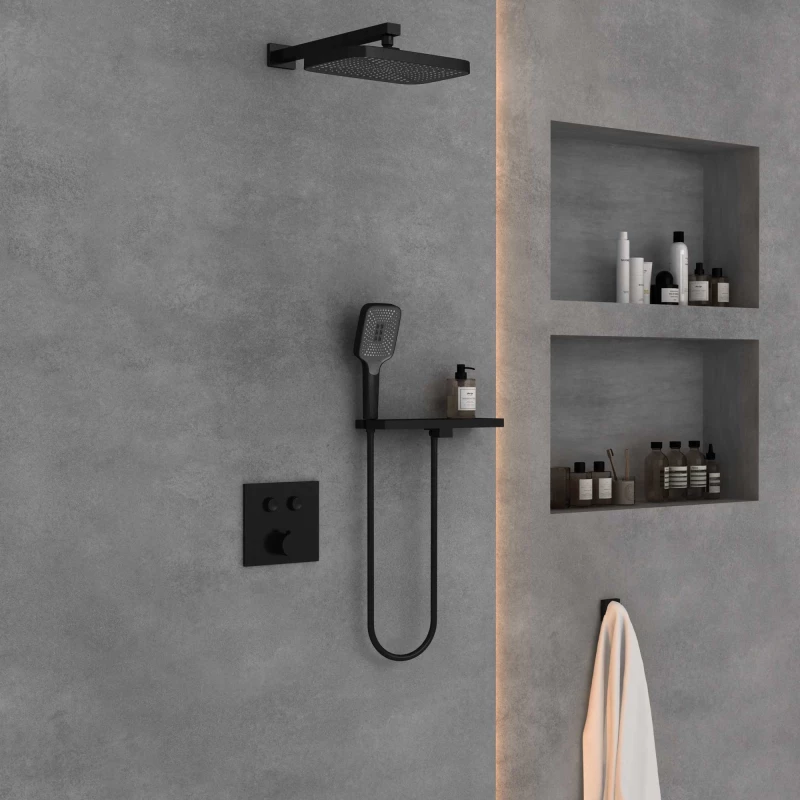 Душевой шланг, Душевая лейка, Подключение для душевого шланга с держателем, Полочка, Верхний душ, Скрытая монтажная часть, Смеситель, Кронштейн