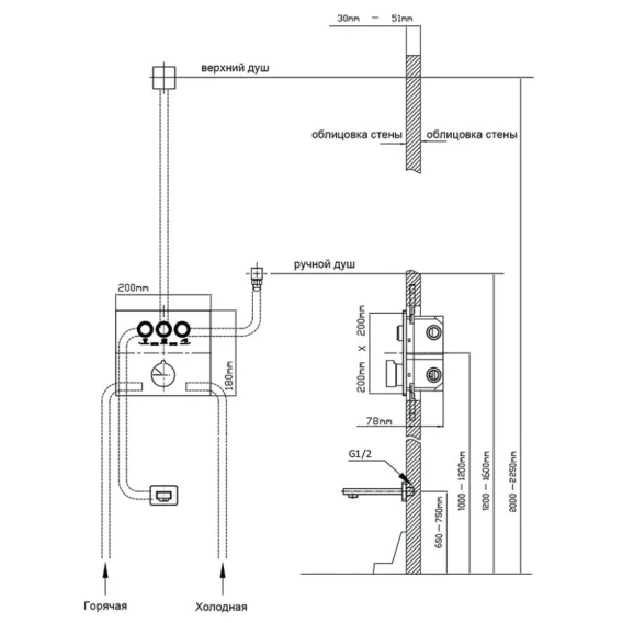Аэратор, Душевой шланг, Душевая лейка, Подключение для душевого шланга с держателем, Верхний душ, Излив, Скрытая монтажная часть, Смеситель, Кронштейн