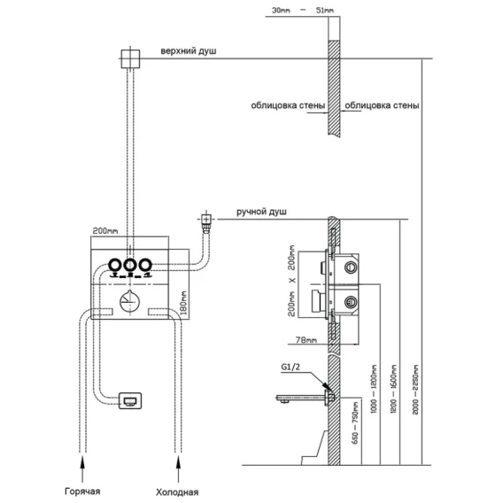 Аэратор, Душевой шланг, Душевая лейка, Подключение для душевого шланга с держателем, Полочка, Верхний душ, Излив, Скрытая монтажная часть, Смеситель, Кронштейн