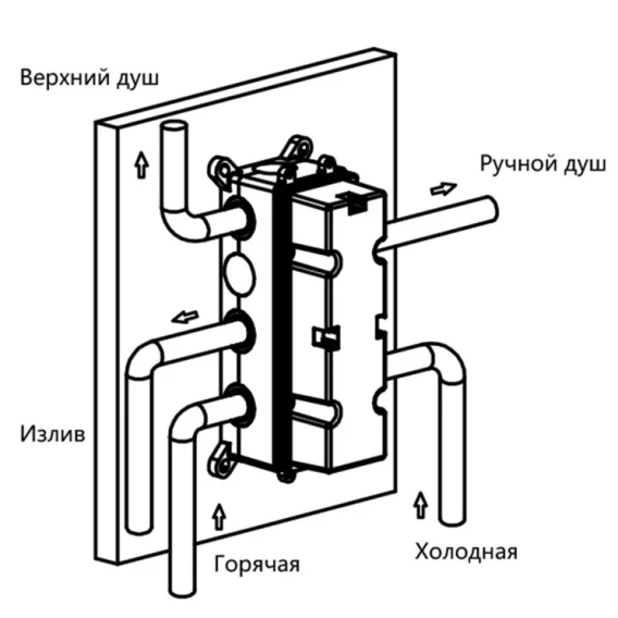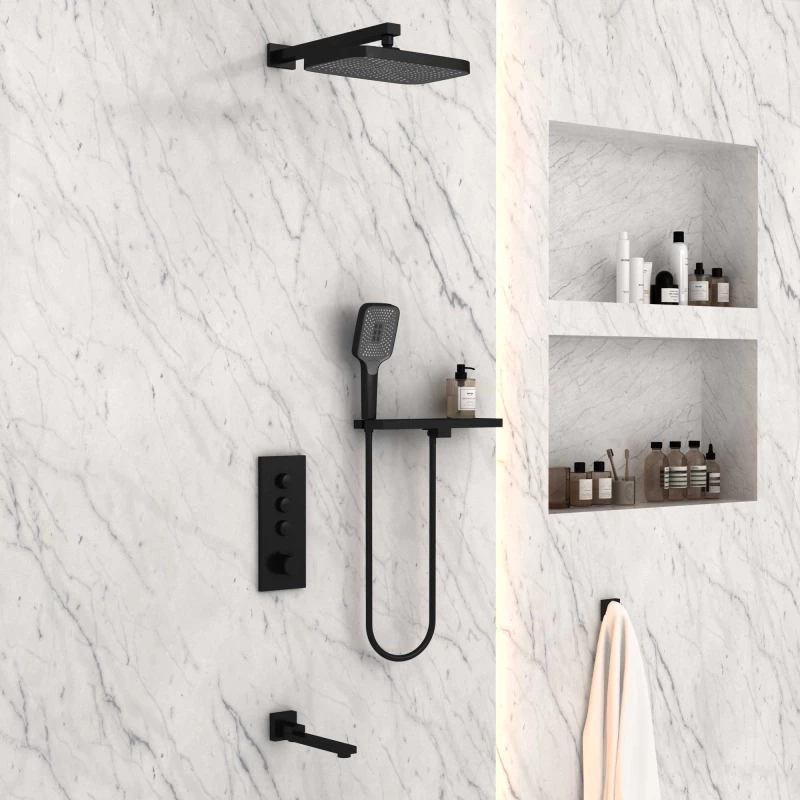 Аэратор, Душевой шланг, Душевая лейка, Подключение для душевого шланга с держателем, Полочка, Верхний душ, Излив, Скрытая монтажная часть, Кронштейн, Термостат