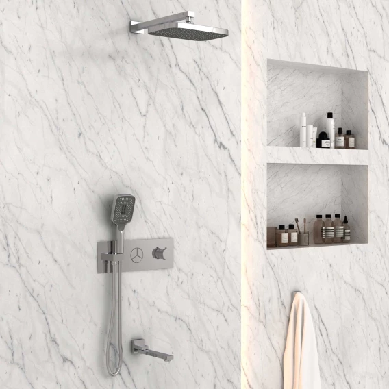 Аэратор, Душевой шланг, Душевая лейка, Подключение для душевого шланга с держателем, Верхний душ, Излив, Скрытая монтажная часть, Кронштейн, Термостат