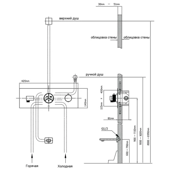 Аэратор, Душевой шланг, Душевая лейка, Подключение для душевого шланга с держателем, Верхний душ, Излив, Скрытая монтажная часть, Кронштейн, Термостат