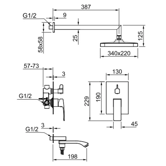 Аэратор, Душевой шланг, Душевая лейка, Держатель для душевой лейки, Верхний душ, Излив, Скрытая монтажная часть, Смеситель, Кронштейн