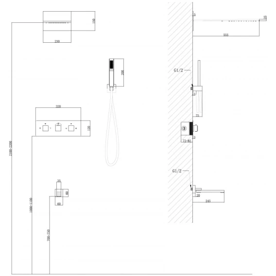 Аэратор, Душевой шланг, Душевая лейка, Подключение для душевого шланга с держателем, Верхний душ, Излив, Скрытая монтажная часть, Кронштейн, Термостат