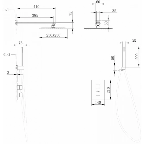 Душевой шланг, Душевая лейка, Подключение для душевого шланга с держателем, Верхний душ, Скрытая монтажная часть, Кронштейн, Термостат