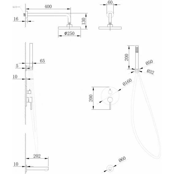 Аэратор, Душевой шланг, Душевая лейка, Подключение для душевого шланга с держателем, Верхний душ, Излив, Скрытая монтажная часть, Смеситель, Кронштейн