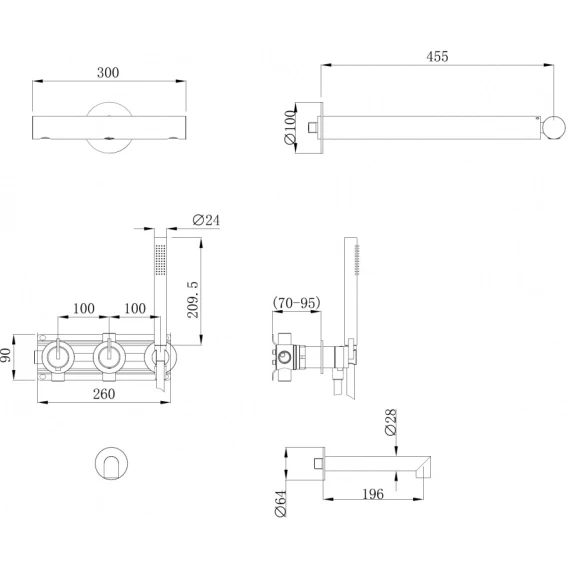 Аэратор, Душевой шланг, Душевая лейка, Подключение для душевого шланга с держателем, Верхний душ, Излив, Скрытая монтажная часть, Смеситель, Кронштейн