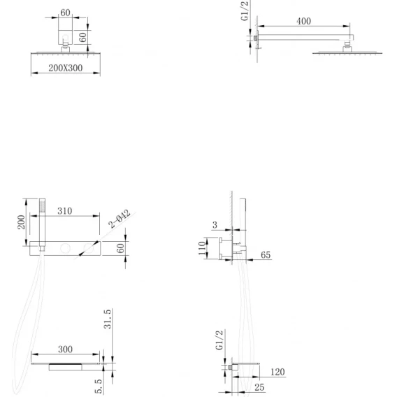 Душевой шланг, Душевая лейка, Подключение для душевого шланга с держателем, Полочка, Верхний душ, Излив, Скрытая монтажная часть, Кронштейн, Термостат