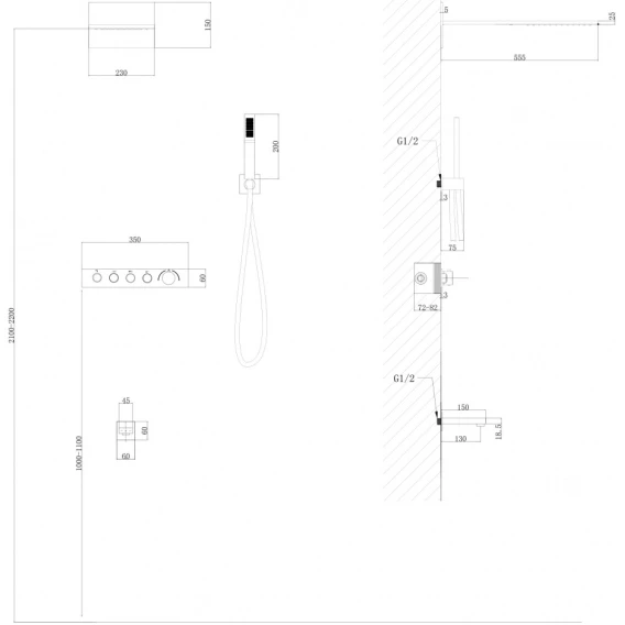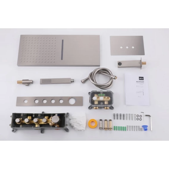 Аэратор, Душевой шланг, Душевая лейка, Подключение для душевого шланга с держателем, Верхний душ, Излив, Скрытая монтажная часть, Кронштейн, Термостат