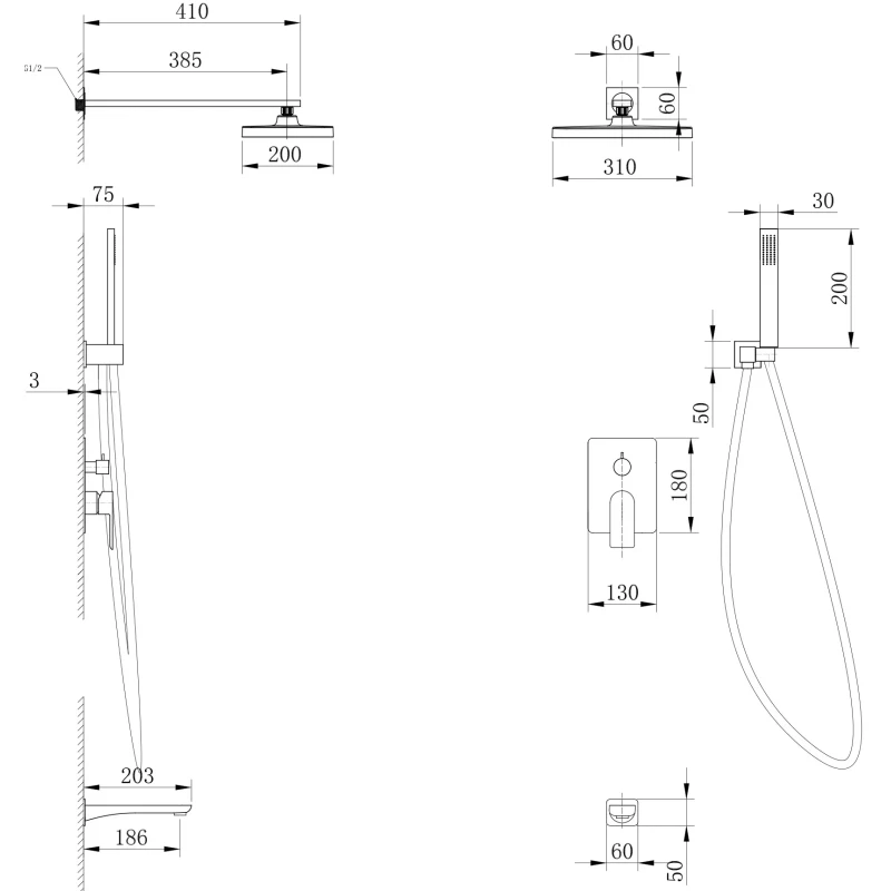 Аэратор, Душевой шланг, Душевая лейка, Подключение для душевого шланга с держателем, Верхний душ, Излив, Скрытая монтажная часть, Смеситель, Кронштейн