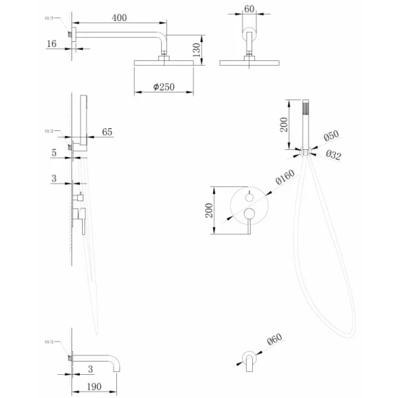 Аэратор, Душевой шланг, Душевая лейка, Подключение для душевого шланга с держателем, Верхний душ, Излив, Скрытая монтажная часть, Смеситель, Кронштейн