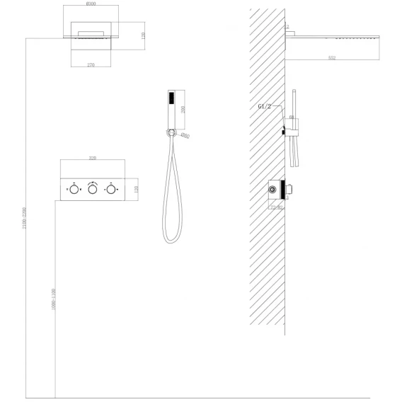 Душевой шланг, Душевая лейка, Подключение для душевого шланга с держателем, Верхний душ, Скрытая монтажная часть, Кронштейн, Термостат