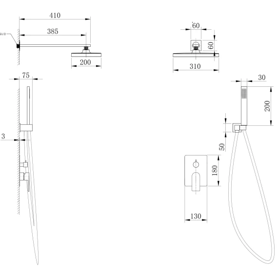Душевой шланг, Душевая лейка, Подключение для душевого шланга с держателем, Верхний душ, Скрытая монтажная часть, Смеситель, Кронштейн