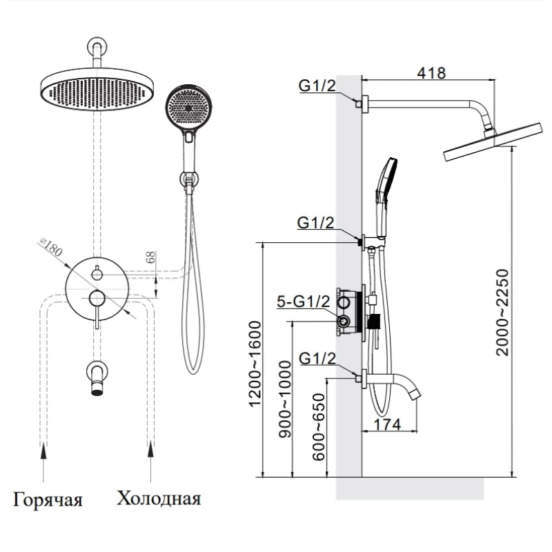 Аэратор, Душевой шланг, Душевая лейка, Подключение для душевого шланга с держателем, Верхний душ, Излив, Скрытая монтажная часть, Смеситель, Кронштейн