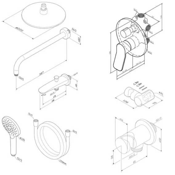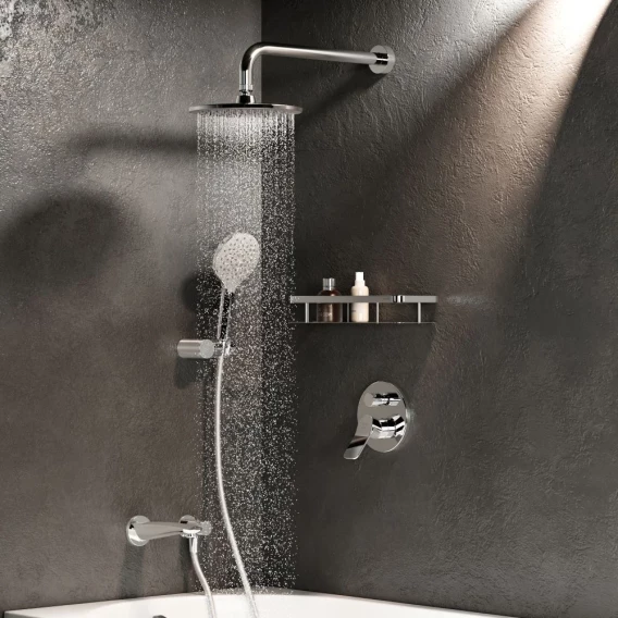 Аэратор, Душевой шланг, Душевая лейка, Держатель для душевой лейки, Подключение для душевого шланга, Верхний душ, Излив, Скрытая монтажная часть, Смеситель, Кронштейн