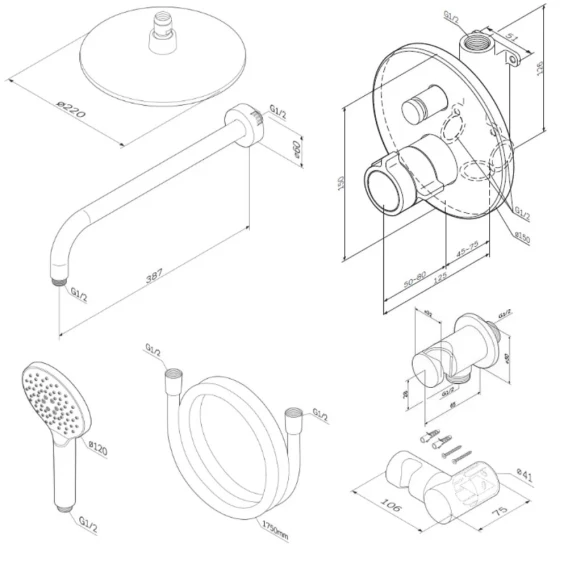 Душевой шланг, Душевая лейка, Держатель для душевой лейки, Подключение для душевого шланга, Верхний душ, Скрытая монтажная часть, Смеситель, Кронштейн