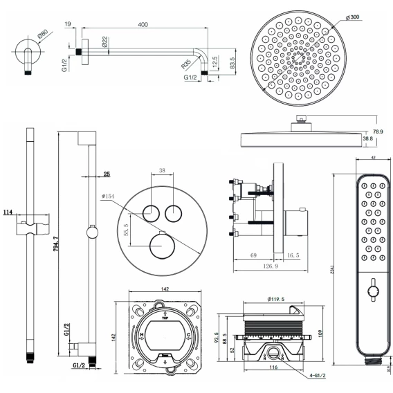 Душевой шланг, Душевая лейка, Держатель для душевой лейки, Подключение для душевого шланга, Верхний душ, Скрытая монтажная часть, Кронштейн, Штанга душевая, Термостат