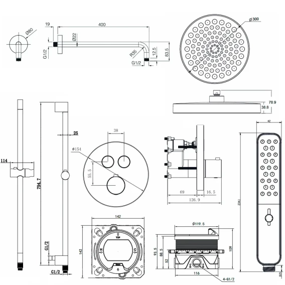 Душевой шланг, Душевая лейка, Держатель для душевой лейки, Подключение для душевого шланга, Верхний душ, Скрытая монтажная часть, Кронштейн, Штанга душевая, Термостат