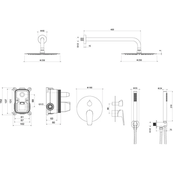 Душевой шланг, Душевая лейка, Подключение для душевого шланга с держателем, Верхний душ, Скрытая монтажная часть, Смеситель, Кронштейн