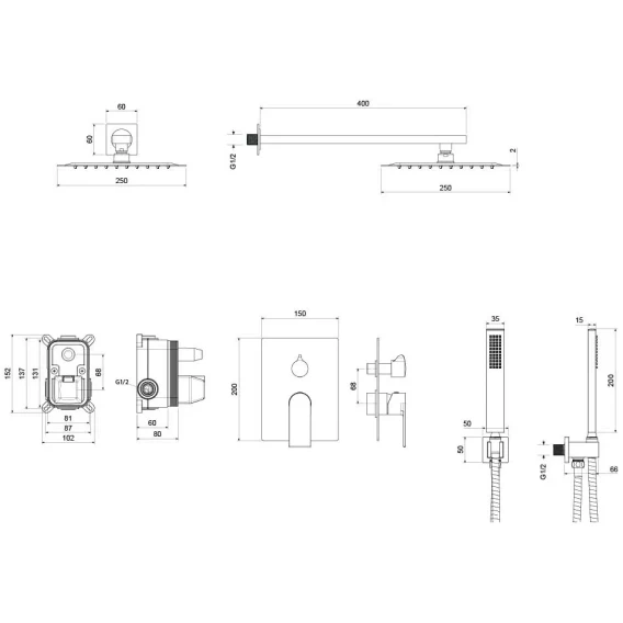 Душевой шланг, Душевая лейка, Подключение для душевого шланга с держателем, Верхний душ, Скрытая монтажная часть, Смеситель, Кронштейн