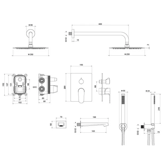 Аэратор, Душевой шланг, Душевая лейка, Подключение для душевого шланга с держателем, Верхний душ, Излив, Скрытая монтажная часть, Смеситель, Кронштейн