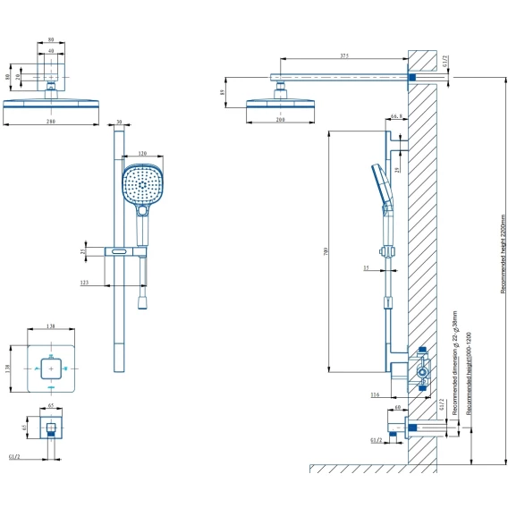 Крепление, Душевой шланг, Душевая лейка, Держатель для душевой лейки, Подключение для душевого шланга, Верхний душ, Скрытая монтажная часть, Смеситель, Кронштейн, Штанга душевая