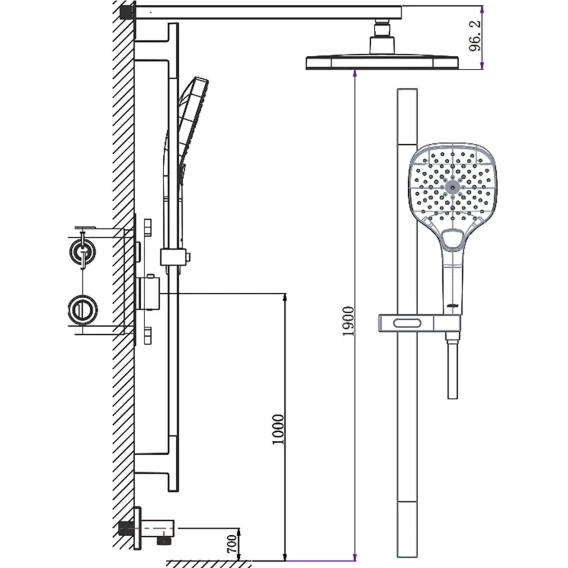 Душевой шланг, Душевая лейка, Держатель для душевой лейки, Подключение для душевого шланга, Верхний душ, Скрытая монтажная часть, Кронштейн, Штанга душевая, Термостат