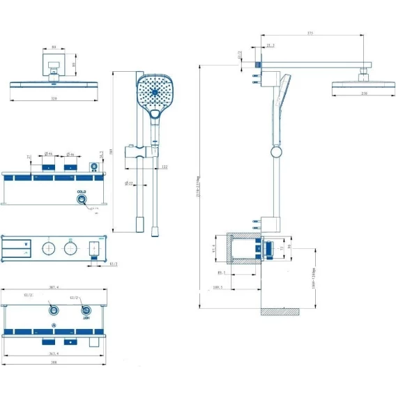 Душевой шланг, Душевая лейка, Держатель для душевой лейки, Подключение для душевого шланга, Верхний душ, Скрытая монтажная часть, Кронштейн, Штанга душевая, Термостат
