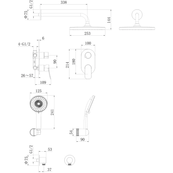 Душевой шланг, Душевая лейка, Держатель для душевой лейки, Подключение для душевого шланга, Верхний душ, Скрытая монтажная часть, Смеситель, Кронштейн