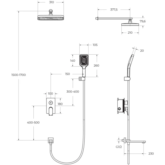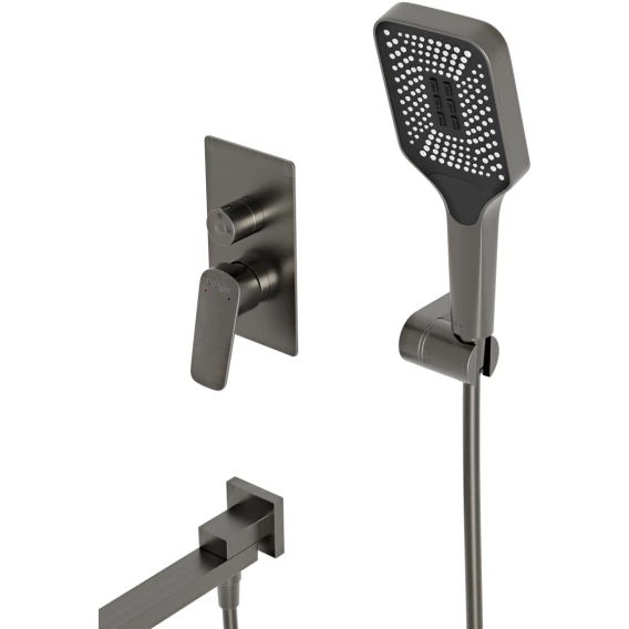 Аэратор, Душевой шланг, Душевая лейка, Подключение для душевого шланга с держателем, Верхний душ, Излив, Скрытая монтажная часть, Смеситель, Кронштейн