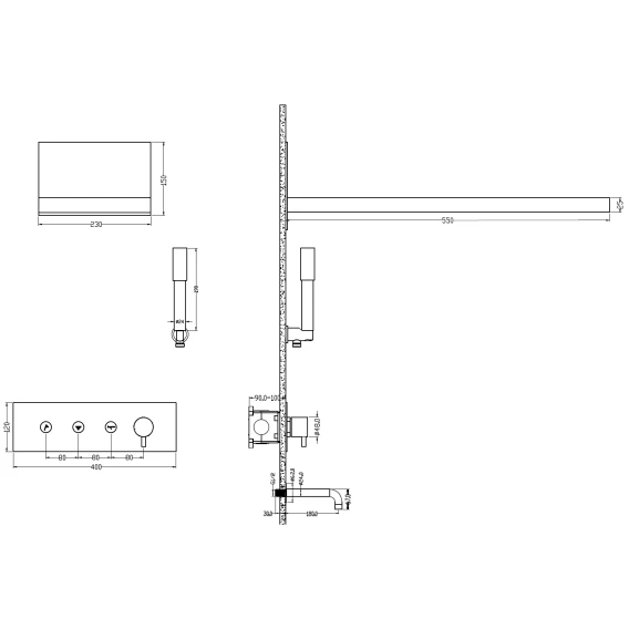 Аэратор, Душевой шланг, Душевая лейка, Подключение для душевого шланга с держателем, Верхний душ, Излив, Скрытая монтажная часть, Смеситель, Кронштейн