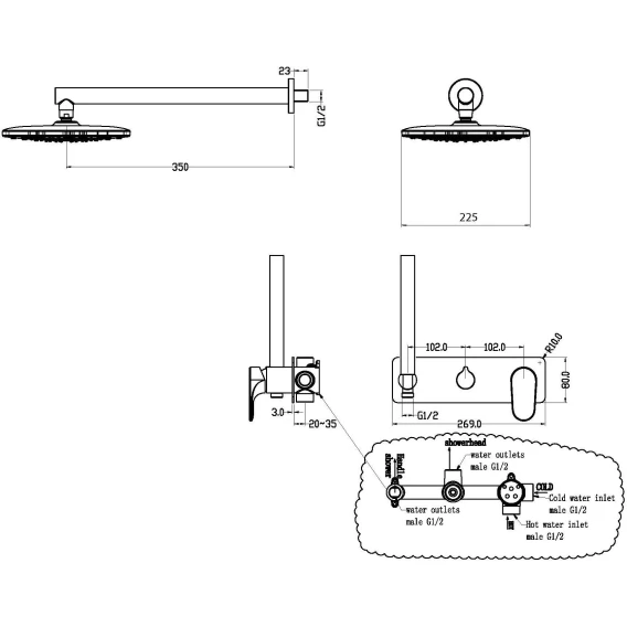 Душевой шланг, Душевая лейка, Подключение для душевого шланга с держателем, Верхний душ, Скрытая монтажная часть, Смеситель, Кронштейн