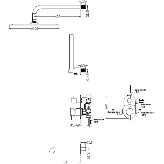 Душевой шланг, Душевая лейка, Подключение для душевого шланга с держателем, Верхний душ, Излив, Скрытая монтажная часть, Смеситель, Кронштейн