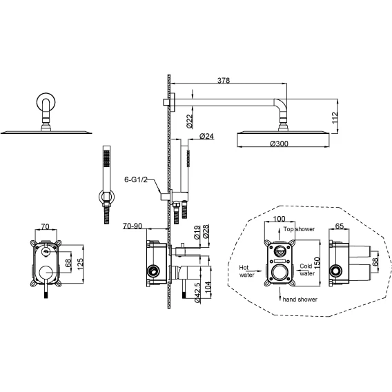 Душевой шланг, Душевая лейка, Подключение для душевого шланга с держателем, Верхний душ, Скрытая монтажная часть, Смеситель, Кронштейн
