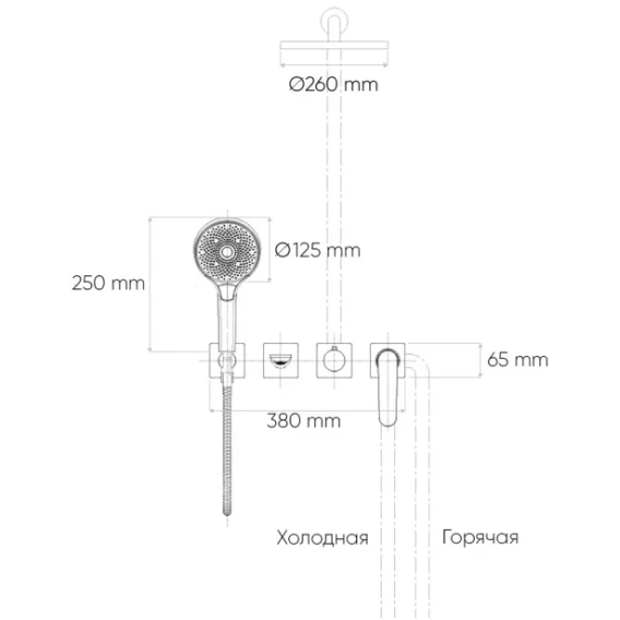 Аэратор, Душевой шланг, Душевая лейка, Подключение для душевого шланга с держателем, Верхний душ, Излив, Скрытая монтажная часть, Смеситель, Кронштейн