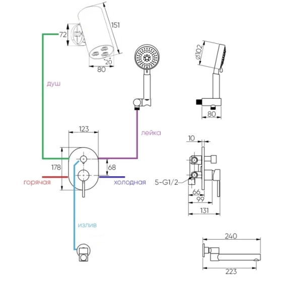 Аэратор, Душевой шланг, Душевая лейка, Подключение для душевого шланга с держателем, Верхний душ, Излив, Скрытая монтажная часть, Смеситель