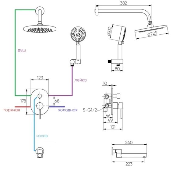 Аэратор, Душевой шланг, Душевая лейка, Подключение для душевого шланга с держателем, Верхний душ, Излив, Скрытая монтажная часть, Смеситель, Кронштейн