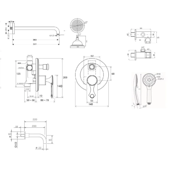 Аэратор, Душевой шланг, Душевая лейка, Подключение для душевого шланга с держателем, Верхний душ, Излив, Скрытая монтажная часть, Смеситель, Кронштейн