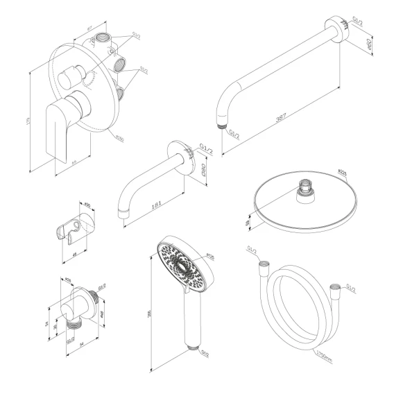 Аэратор, Душевой шланг, Душевая лейка, Держатель для душевой лейки, Подключение для душевого шланга, Верхний душ, Излив, Скрытая монтажная часть, Смеситель, Кронштейн