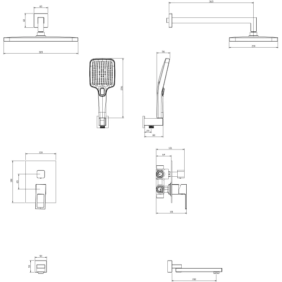 Аэратор, Душевой шланг, Душевая лейка, Подключение для душевого шланга с держателем, Верхний душ, Излив, Скрытая монтажная часть, Смеситель, Кронштейн