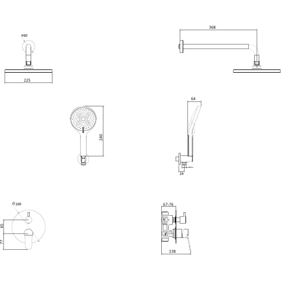 Душевой шланг, Душевая лейка, Подключение для душевого шланга с держателем, Верхний душ, Скрытая монтажная часть, Смеситель, Кронштейн
