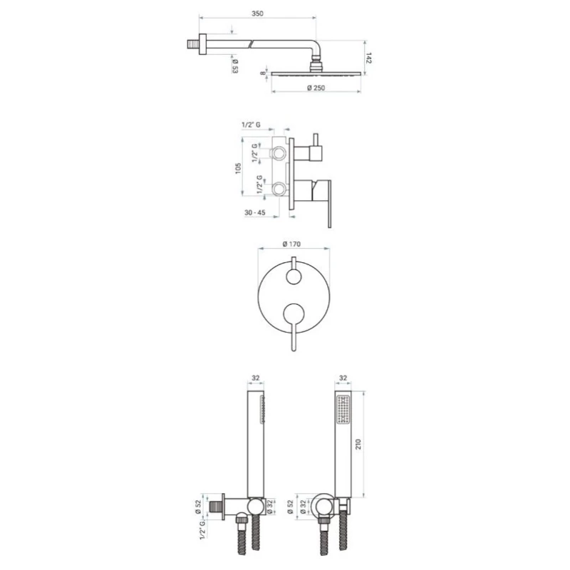Душевой шланг, Душевая лейка, Подключение для душевого шланга с держателем, Верхний душ, Скрытая монтажная часть, Смеситель, Кронштейн