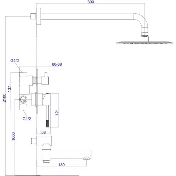 Аэратор, Душевой шланг, Душевая лейка, Держатель для душевой лейки, Подключение для душевого шланга, Верхний душ, Излив, Скрытая монтажная часть, Смеситель, Кронштейн