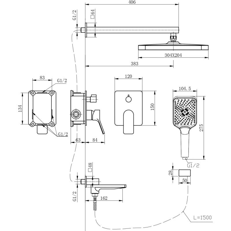 Аэратор, Душевой шланг, Душевая лейка, Держатель для душевой лейки, Подключение для душевого шланга, Верхний душ, Излив, Скрытая монтажная часть, Смеситель, Кронштейн
