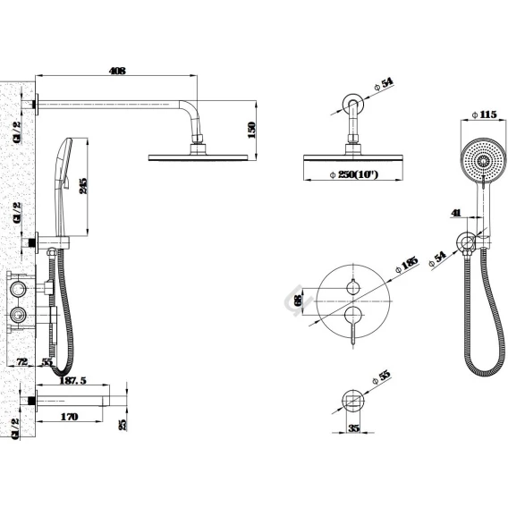 Аэратор, Душевой шланг, Душевая лейка, Подключение для душевого шланга с держателем, Верхний душ, Излив, Скрытая монтажная часть, Смеситель, Кронштейн